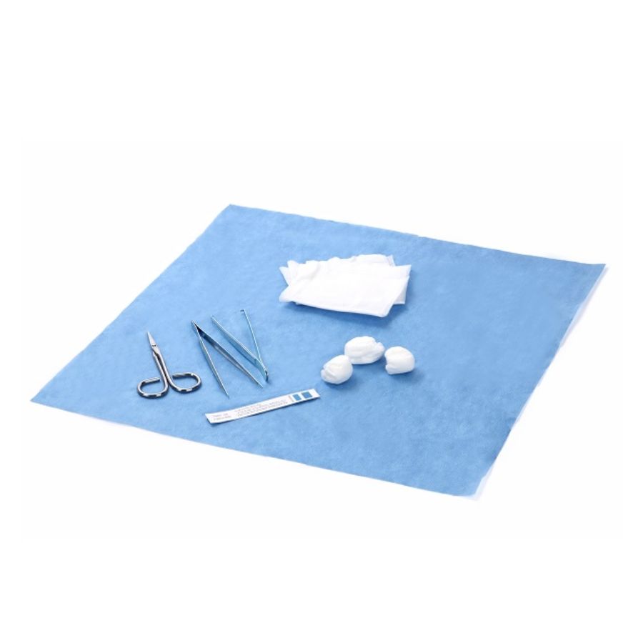 Keermepaelad, 35g/m², 3 tk Ühekordsed sidumistangid, metallist, terava otsaga, 12cm, 1 tk Koetangid, metallist, 12cm, 1 tk Spunlace padjad, 14,5 x 19,35 cm, kokkupandud suurus 7,25 x 9,75 cm, 4-kihiline, 3 tk Õmbluse eemaldamise käärid, metall, 14cm, 1 tk Kandik, 17 x 11 cm, 1 tk Mähis, 40 x 40cm, 35g/m² SMS lausriie, 1 tk Steriliseerimise indikaatorkaart, 1 tk |